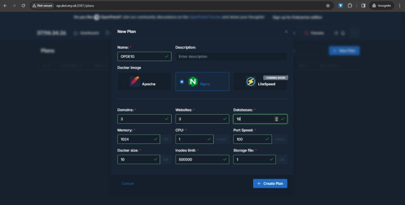 Create Plans: Error executing command: Command 'opencli plan-create 'OPDE1G' 'Hosting 1GB' 3 3 10 500000 100 1 1 nginx 100 1' returned non-zero exit status 1.